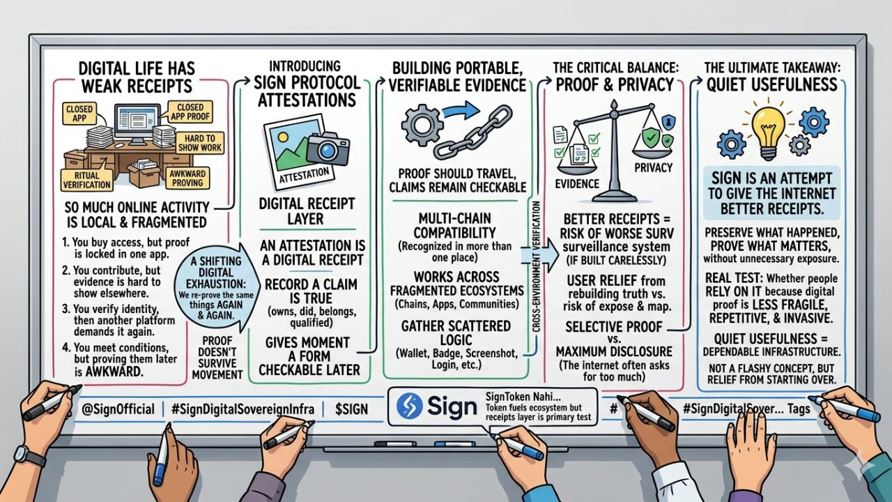 Pentru că Sign pare să fie construit în jurul ideii că dovada digitală nu ar trebui să se estompeze în secunda în care părăsești camera în care a fost creată. Chitanța ar trebui să călătorească. Declarația ar trebui să rămână verificabilă. Semnificația ar trebui să rămână atașată acțiunii.