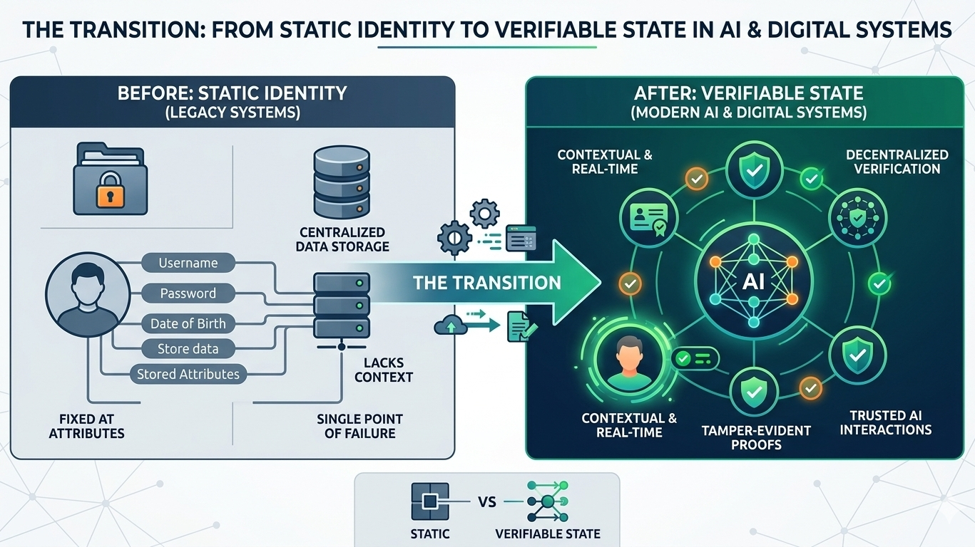 Gândește-te la asta. „Starea” ta ar putea include istoricul tău de tranzacții, tiparele tale de comportament, acreditivele tale, poate chiar și semnalele de conformitate. Nu este un singur lucru. Este un pachet. Și se actualizează continuu.