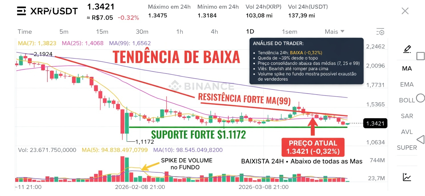 Preço despencou de 2.1924 pra 1.3421 (queda de ~39% desde o topo), e nas últimas 24 horas perdeu -0,32% enquanto continua firmemente abaixo de TODAS as médias móveis (MA7, MA25 e MA99).