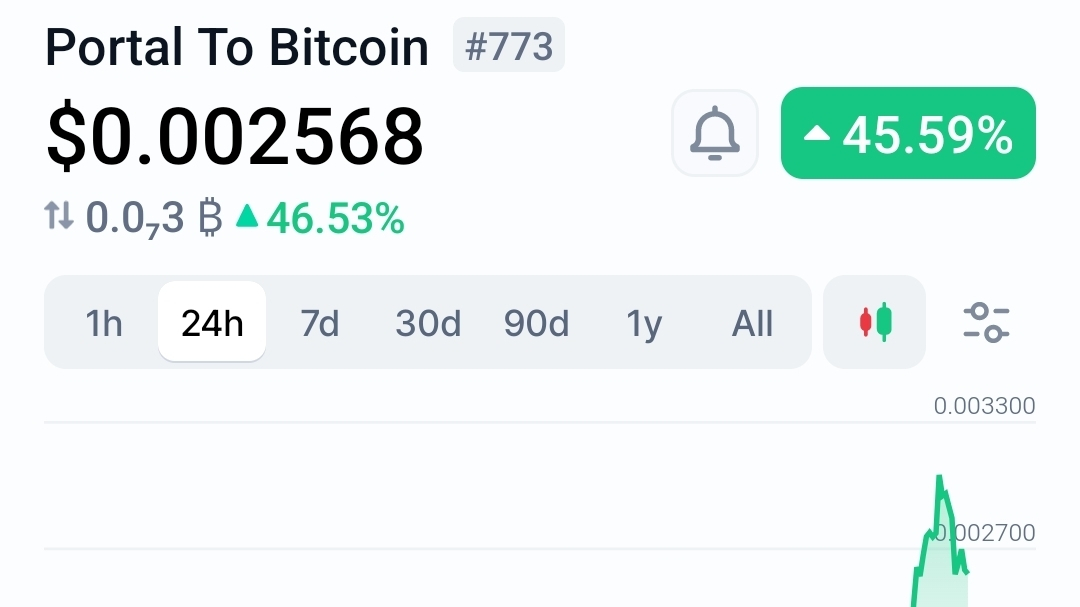 Portal To Bitcoin is up 45.81% to $0.00259 in 24h, sharply outperforming a flat broader market, primarily driven by a surge in speculative trading volume. No clear coin-specific catalyst was visible in the provided data.
