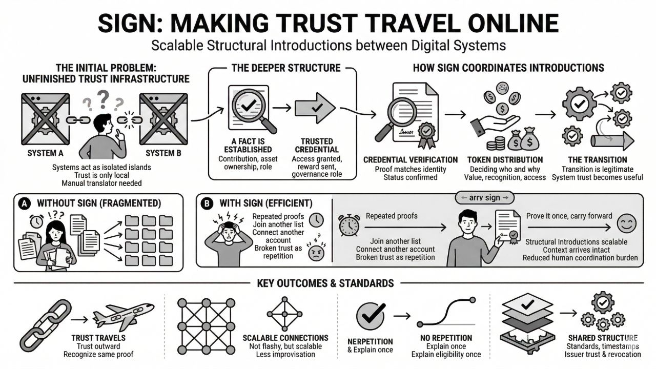 Pentru că cea mai mare parte a poverii de coordonare a internetului provine încă din introduceri slabe. Sistemele știu lucruri, dar nu știu cum să prezinte acele lucruri unii altora într-un mod stabil... Așa că, atunci când mă gândesc la SIGN din acest unghi, nu mă gândesc cu adevărat la el ca la o adăugare de obiecte digitale. Mă gândesc la el ca la o încercare de a face încrederea să călătorească mai curat. Pentru a face ca revendicările să ajungă cu suficient context intact încât următoarea decizie să nu trebuiască să fie reconstruită manual.