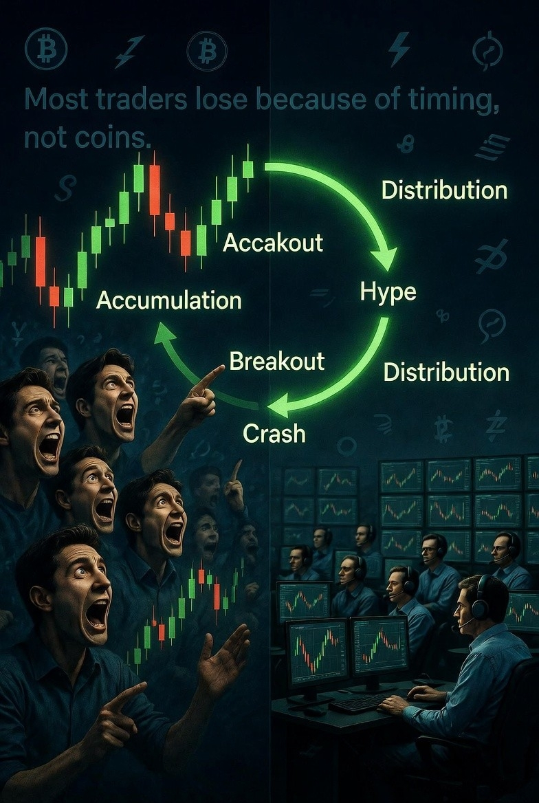 Fiecare piață se mișcă într-un ciclu: Acumulare → Spargere → Hype → Distribuție → Cădere.