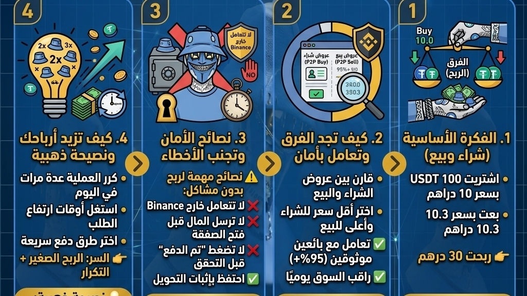 الربح من P2P يُعتبر من أسهل الطرق في عالم الكريبتو، لأنه لا يحتاج تحليل معقد… فقط فهم بسيط لطريقة الشراء والبيع + فرق السعر.