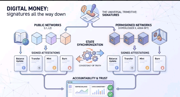 On public chains, this is pretty straightforward. Every transaction is signed. Every balance update is signed. Anyone can verify it.