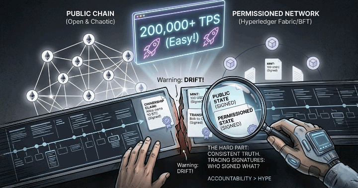 Because if the public side and the permissioned side ever stop agreeing on what’s true even slightly that’s where things break.