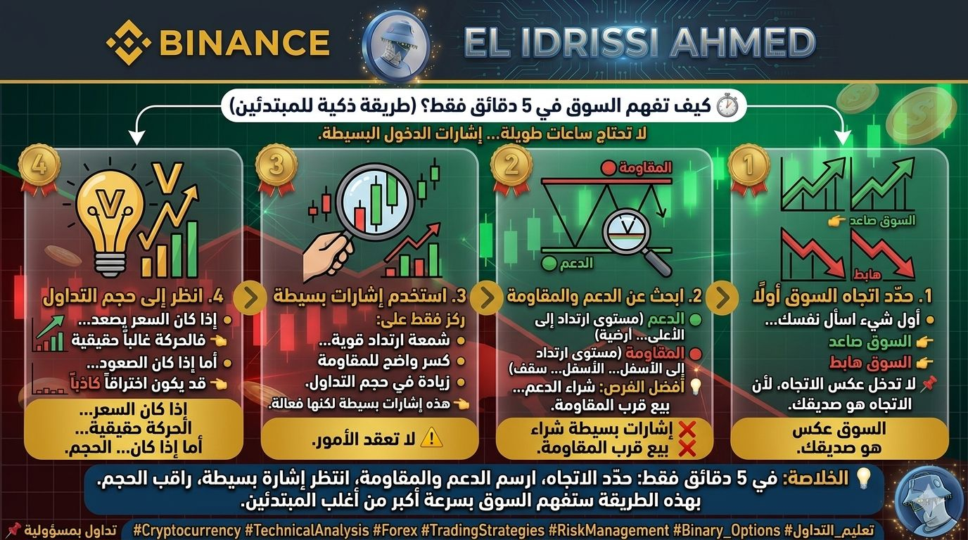 في 5 دقائق فقط يمكنك أخذ فكرة واضحة عن اتجاه السوق + مناطق الدعم والمقاومة + إشارات الدخول البسيطة.