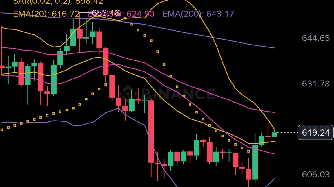 Daily StochRSI at 10.76 with price holding above the BOLL lower at 601.37 and OBV at 37M holding steady gives a credible mean reversion case, though SAR at 645.15 and all three EMAs stacked above between 632 and 774 confirm the dominant daily trend is still bearish. H4 confirmed the bounce with SAR flipping bullish at 598.42 off the 596.01 swing low, but StochRSI is pinned at 99 and OBV remains negative at 8.88M meaning the immediate pop is fully extended and a pullback into the entry zone is needed before continuation. H1 SAR is bullish at 610.27 with OBV turning positive and price tightening below the BOLL upper at 623, a reset into the 608 to 618 EMA cluster is the cleaner entry rather than chasing current price. The key risk is H4 OBV staying negative which signals this is a relief bounce inside a bearish structure and not a trend reversal.