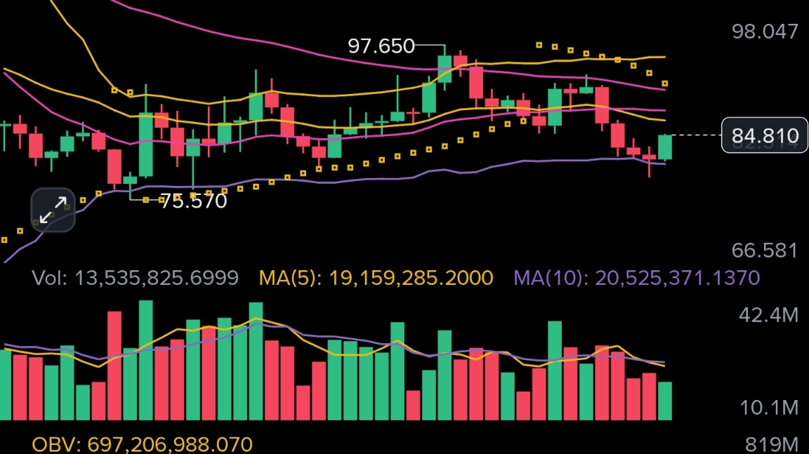 Daily at 84.82 remains below EMA20 at 86.89 and EMA50 at 91.24 with SAR above at 92.16, the macro structure never changed and OBV is still declining confirming the bounce off 78.77 is corrective not structural. H4 SAR flipped bullish at 79.35 which gave the bounce legs, but StochRSI is already pinned at 100 with price pressing the BOLL upper band at 84.70 and OBV still deeply negative at minus 232 million, meaning buyers are running out of firepower right here. H1 at 84.82 shows StochRSI at 90 and price tagging the 24h high at 84.98, the entry zone between 84.50 and 86.00 captures any final push into the daily EMA20 at 86.89 before sellers take back control. Main risk is if daily StochRSI at 10 catches a broader market bid and drives price through 86.89 forcing a reassessment.
