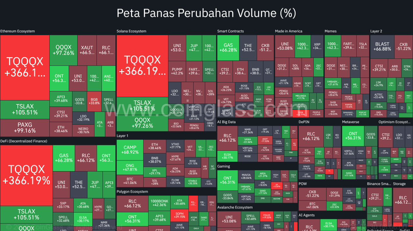 Piața arată o creștere foarte agresivă a volumului, cu dominanța TQQQX (+366.19%) ca lider principal în diverse sectoare precum DeFi și Ethereum. Această creștere este susținută de TSLAX (+105.51%) și QQOX (+97.26%) care contribuie la distribuția volumului către mai multe active. Suport suplimentar din partea ONT (+56.31%), GAS (+66.28%), RLC (+66.12%) și UNI (+53.08%) indică faptul că piața se află într-o fază de expansiune puternică, cu o participare care începe să se extindă, nu doar concentrată pe o singură narațiune.