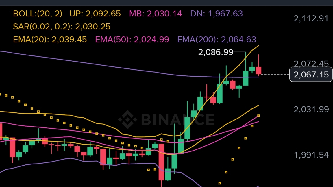 Daily at 2,071 is printing below EMA20 at 2,081 and EMA50 at 2,163 with SAR at 2,209 and OBV at minus 100 million, the macro trend has not changed and this recovery from 1,936 is moving directly into the resistance cluster. H4 SAR flipped bullish at 1,950 giving the bounce structure, but StochRSI is already at 99 with price pressing the H4 BOLL upper band at 2,064 and EMA50 at 2,064, both converging into the same level as a wall. H1 StochRSI at 93 with SAR still below at 2,030 confirms short-term momentum is stretched, and the entry zone between 2,060 and 2,090 sits exactly where the H4 upper band, H1 EMA200 at 2,064 and daily EMA20 all overlap. Main risk is daily StochRSI at 10 is deeply washed out and if BTC holds its bounce this relief move could extend toward 2,117 before sellers take over.