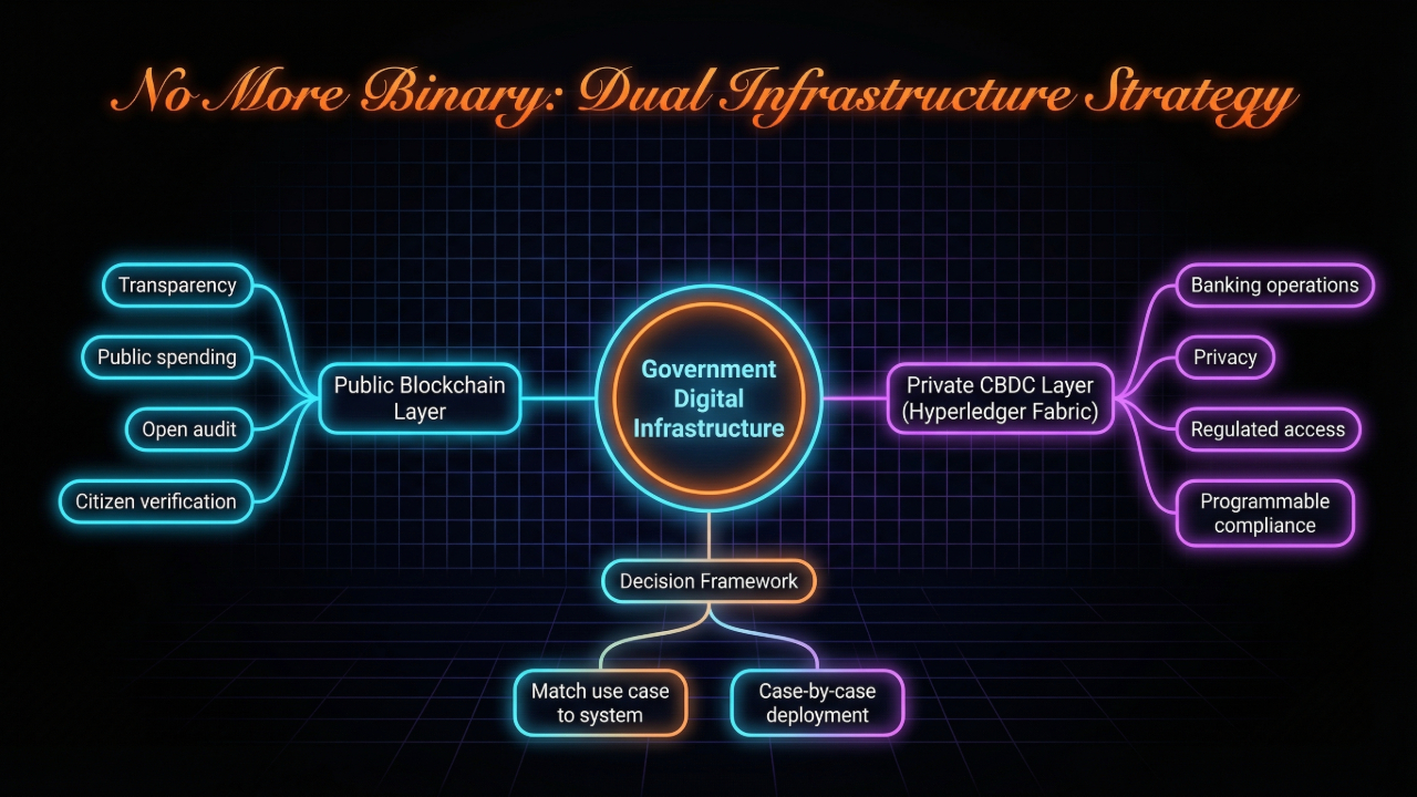 Match the use case to the right tool. Transparent public services go on public blockchain. Private banking operations go on the CBDC layer. International trade and cros-border payments can sit on either side