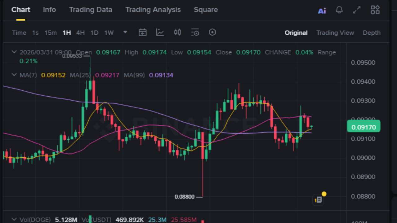 The 1H chart for $DOGE /USDT shows a sideways-to-slightly bullish structure after a recent dip. Price is hovering around key moving averages, indicating indecision with a potential breakout setup forming.