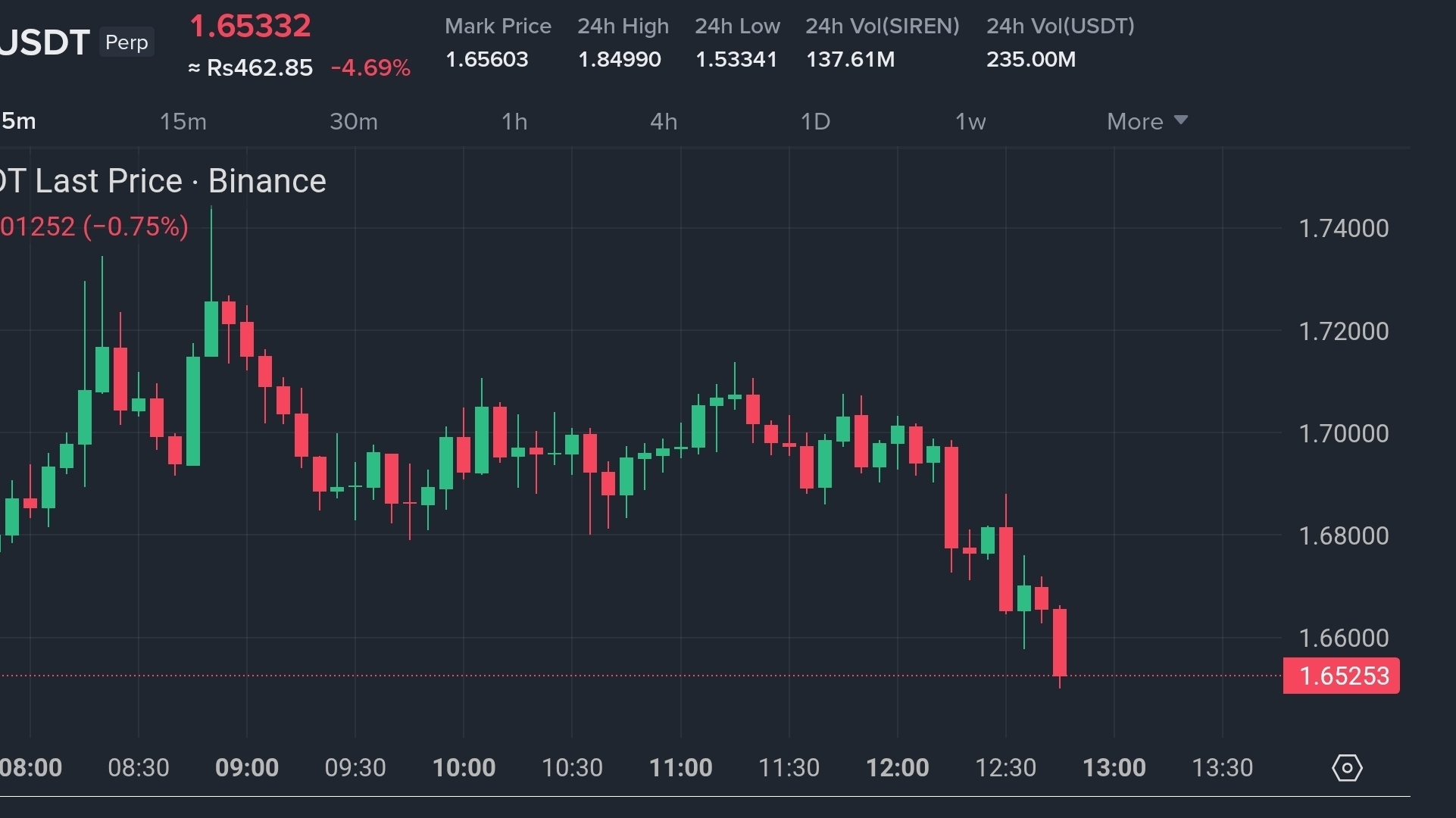 SIREN faced a sharp rejection from the $1.74 resistance. It is currently trading near $1.65, down by -4.69% 📉. The chart is forming "Lower Highs," which suggests that sellers are currently dominating the trend. 🐻