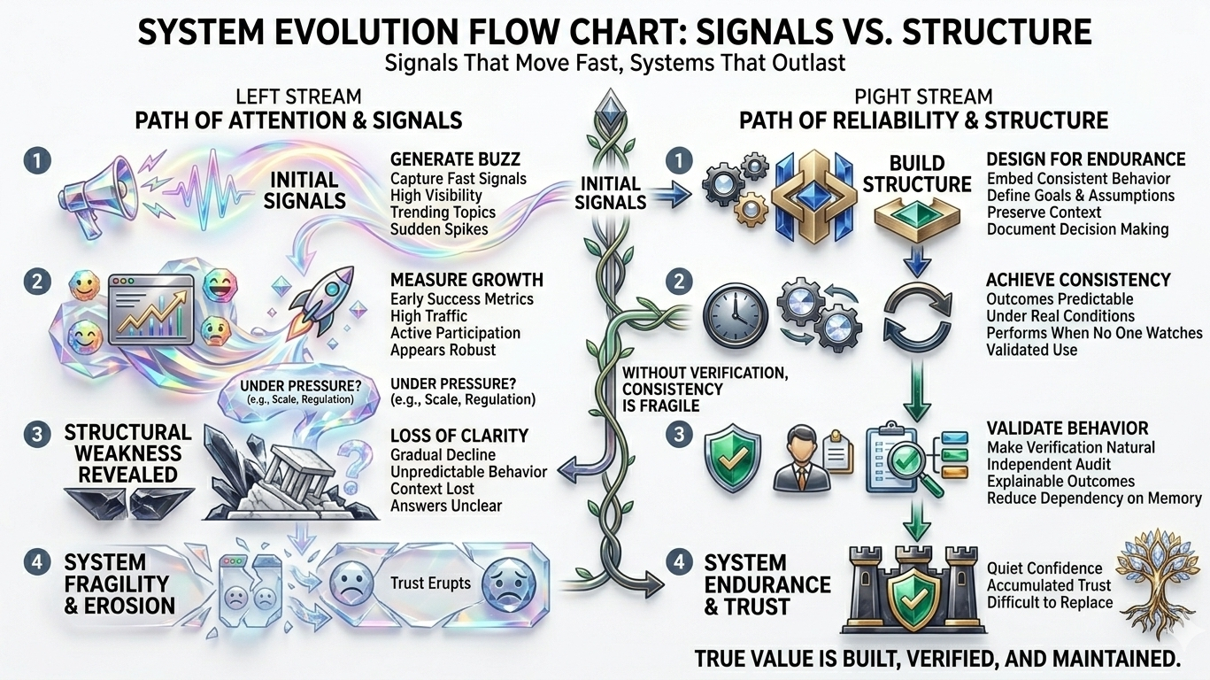 În cele din urmă, sistemele care durează nu sunt întotdeauna cele care sunt cele mai vizibile. Ele sunt cele care continuă să funcționeze atunci când atenția scade, când condițiile se schimbă și când nimeni nu le observă activ. Nu se bazează pe percepție pentru a-și justifica existența. Se bazează pe structură, consistență și verificare—ținând totul împreună într-un mod care devine clar doar când ceva altceva eșuează.
