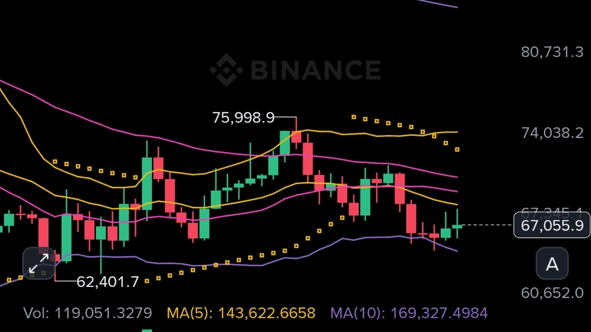 Daily at 67,055 is sitting between the BOLL lower band at 64,880 and EMA20 at 68,737 with SAR at 73,301 and StochRSI at 14 trying to curl but not showing any reversal, the structure overhead is a wall of declining EMAs and OBV has gone flat after months of distribution. H4 at 67,104 bounced off the 64,918 low but SAR remains above at 68,328, OBV still deeply negative at minus 1.35 million and StochRSI at 71 is now getting stretched on this recovery leg with price pressing directly into the EMA20 at 67,148. H1 at 67,134 is coiling right at the EMA cluster between 67,001 and 68,034 with SAR above at 68,187 and StochRSI at 40 unwinding, a minor push into the 67,400 to 68,050 zone where the H4 BOLL upper band and H1 BOLL upper band converge is the expected path before sellers reload. Main risk is daily StochRSI at 14 is washed out enough that any macro catalyst could squeeze this toward 68,700 before the short becomes clean.