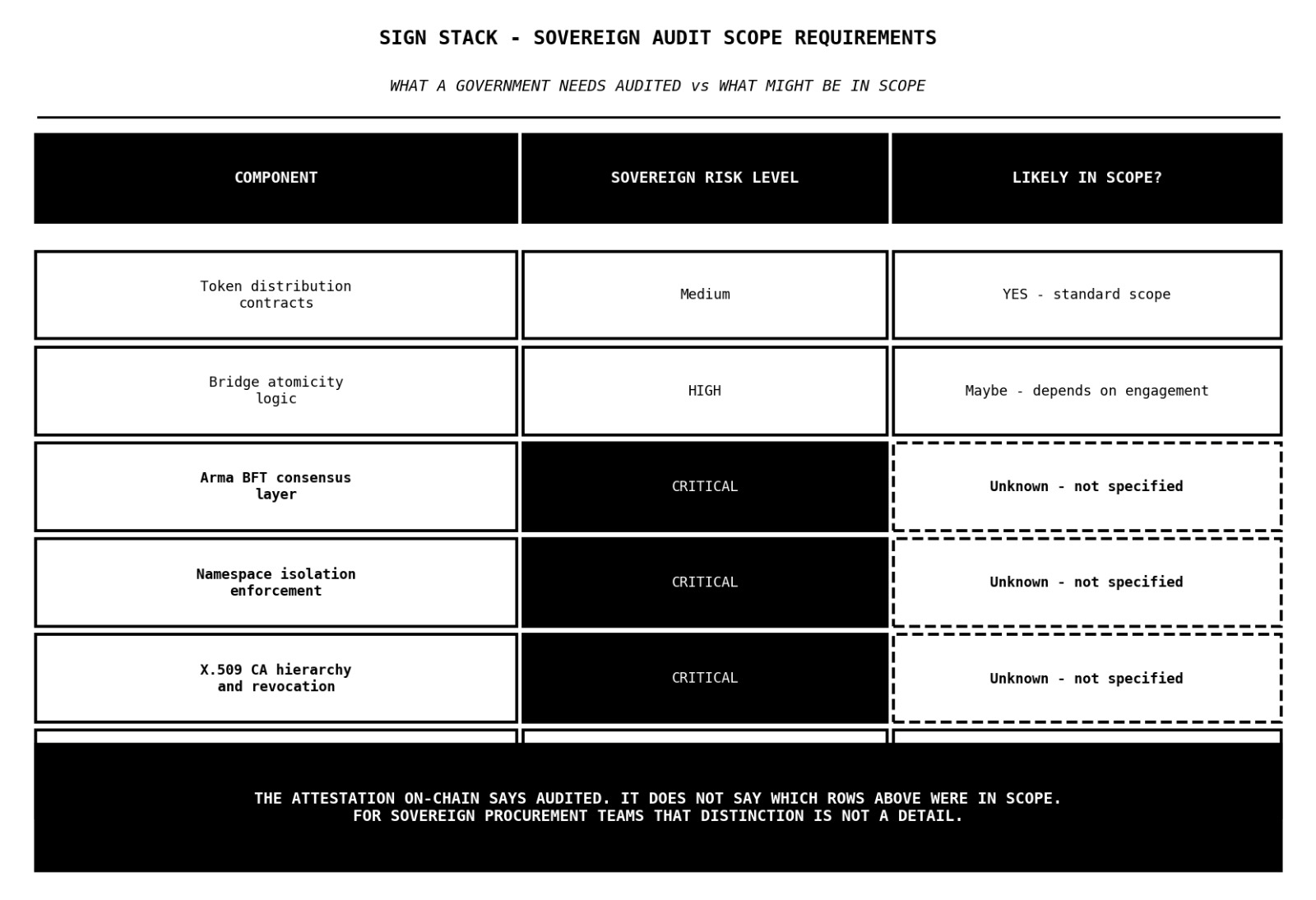 But for a sovereign government evaluating whether to deploy national CBDC infrastructure on a stack with an on-chain audit attestation - the scope question is the entire question. did they audit the Arma BFT consensus layer..... the namespace partitioning logic