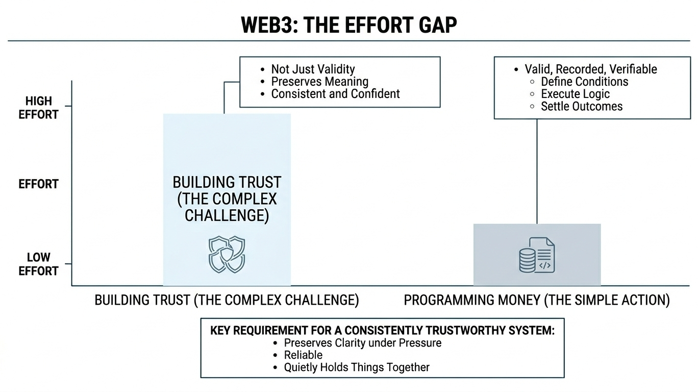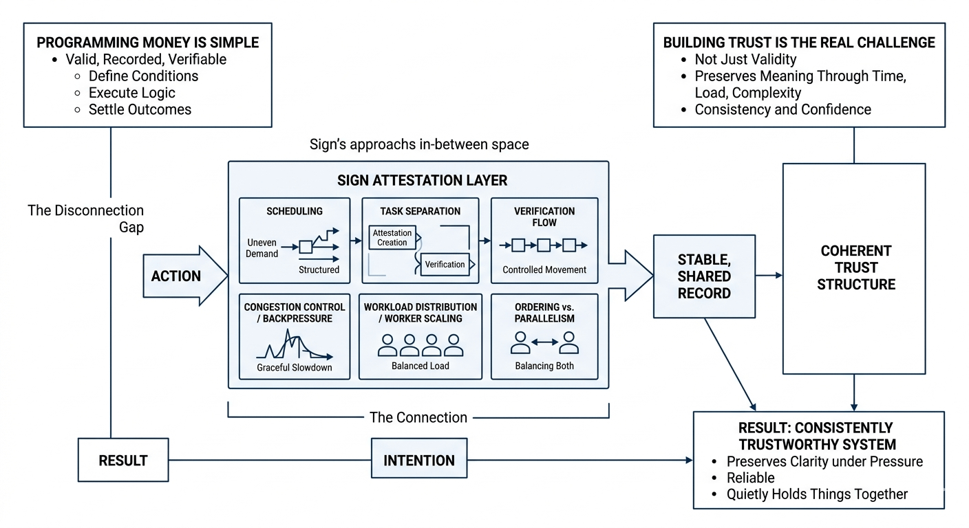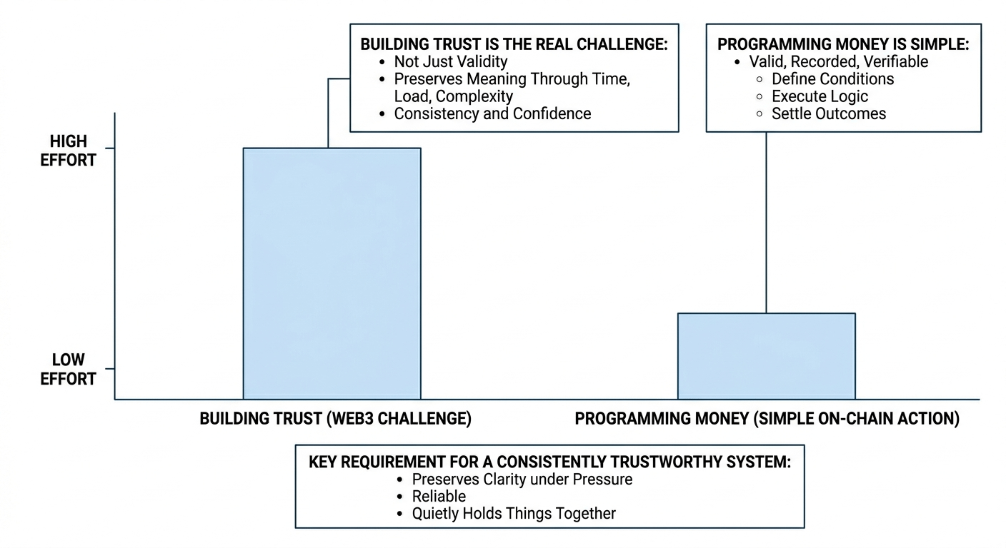 After seeing this kind of thing repeat across different systems, I started to understand a broader pattern in crypto infrastructure. We are very good at making money programmable. We can define conditions, execute logic, and settle outcomes with precision. But what I noticed is that trust doesn’t behave in the same structured way. Trust is not just about whether something is valid it is about whether the system consistently preserves meaning while moving through time, load, and complexity.