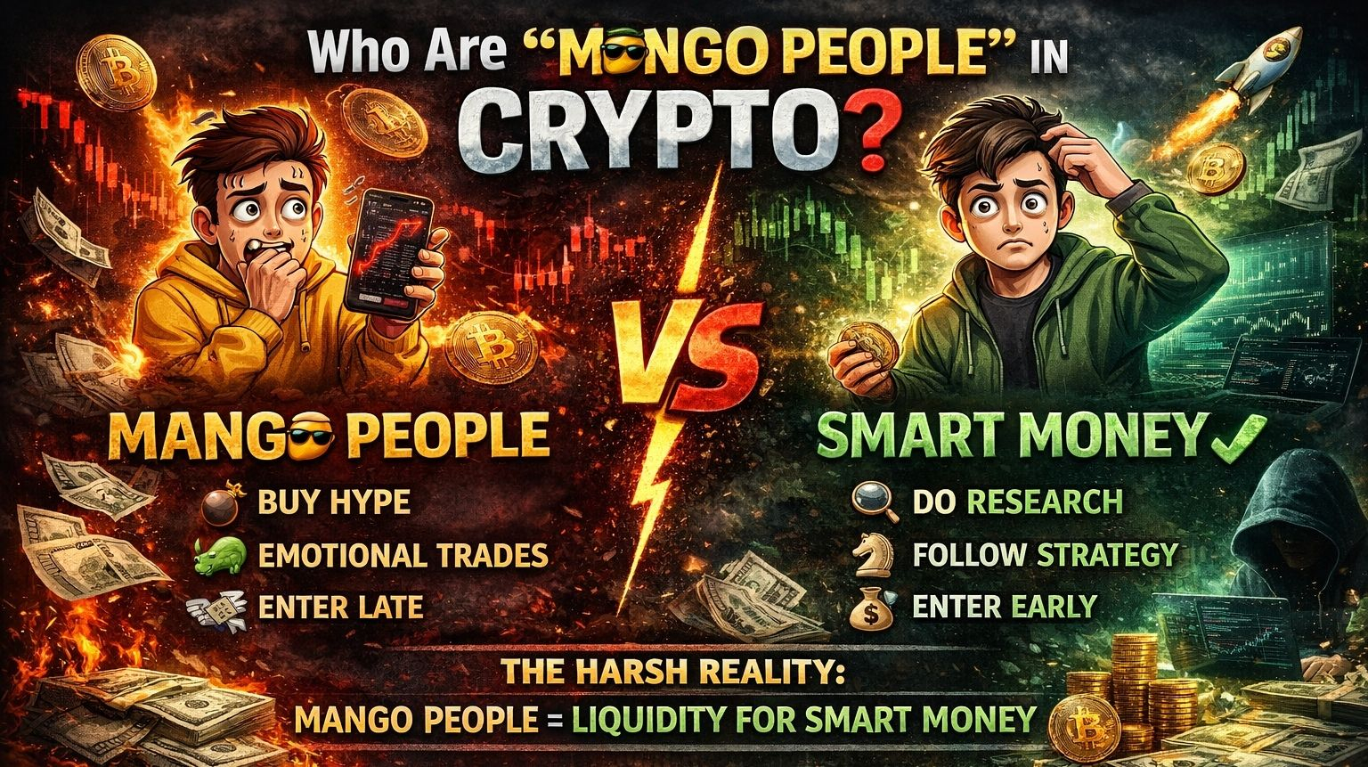 In crypto slang, “mango people” refers to average traders — the majority of participants who enter the market without deep knowledge, strategy, or experience. They are not professionals or insiders. They are everyday users trying to make quick profits, often driven by hype and emotion.