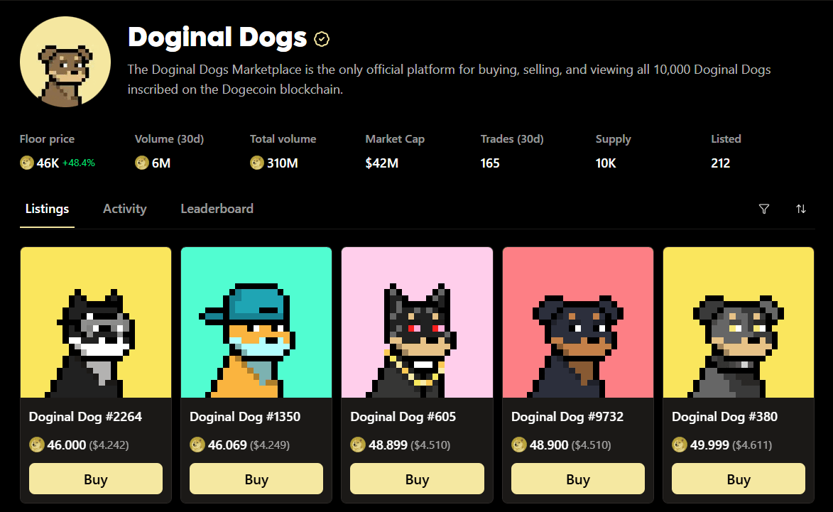 Ce este Doginal Dogs? 10.000 de NFT-uri pixel art înscrise pe blockchain-ul Dogecoin. Monetărie gratuită. Fără VC. Volum de peste 1 miliard de dolari. Clasat pe locul 1 de Binance în 2026.
