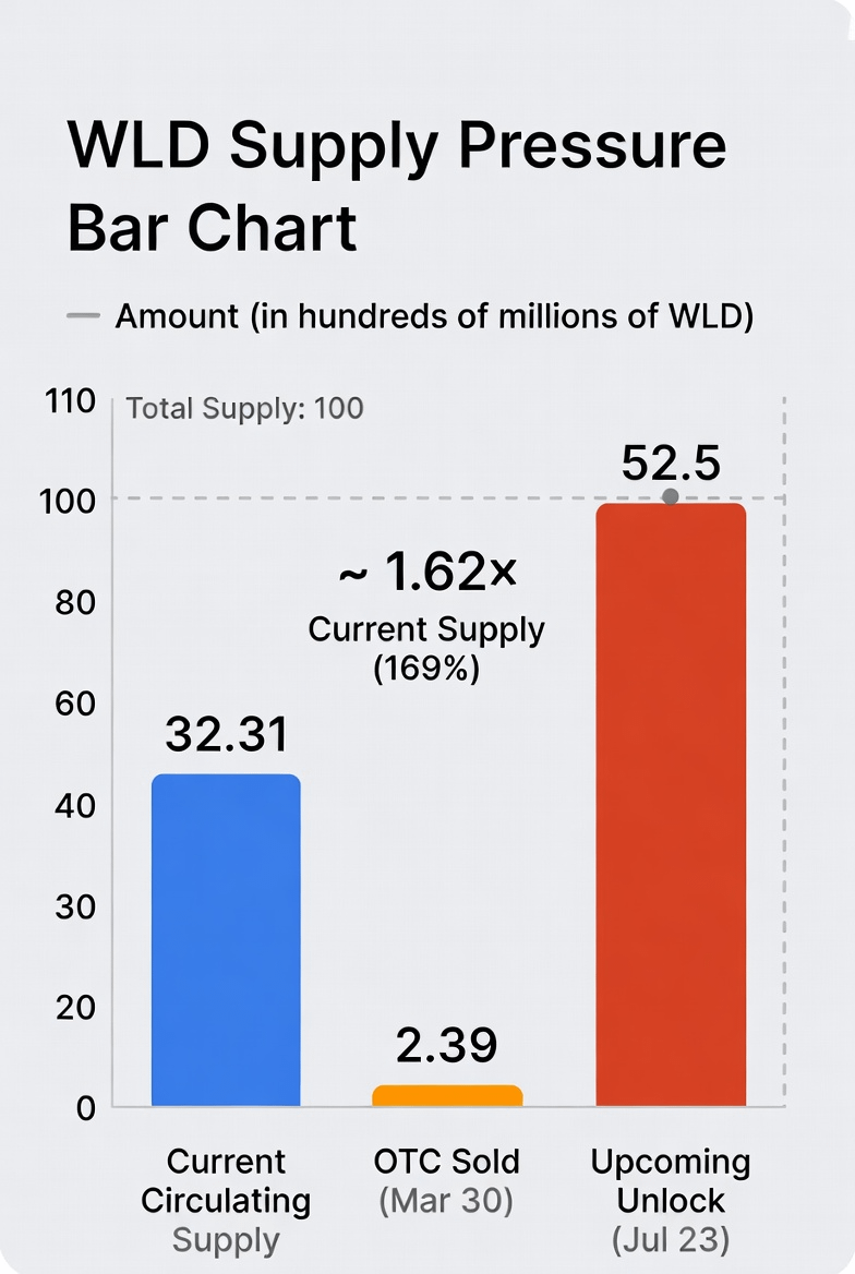 Pe 23 iulie 2026, aproximativ 5.25 miliarde WLD se vor debloca (aproximativ 52.5% din oferta totală, echivalent cu 169% din circulație).