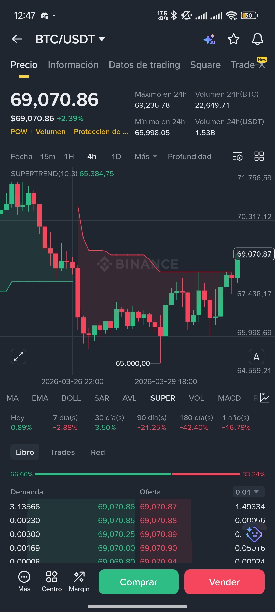 Situación actual: BTC rompió resistencia psicológica y va directo hacia los $70,000. El volumen 24h de $49.8M en cadena confirma momentum comprador real.