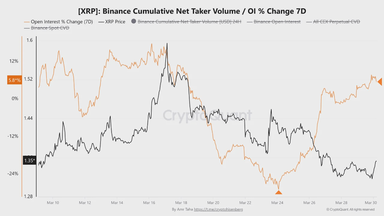 Intervalul intraday a fost strâns: maxim de $1.3585, minim de $1.3523, cu un volum de 2.02 milioane XRP pe oră. La suprafață pare a fi o consolidare. Sub aceasta, datele acumulează presiune.