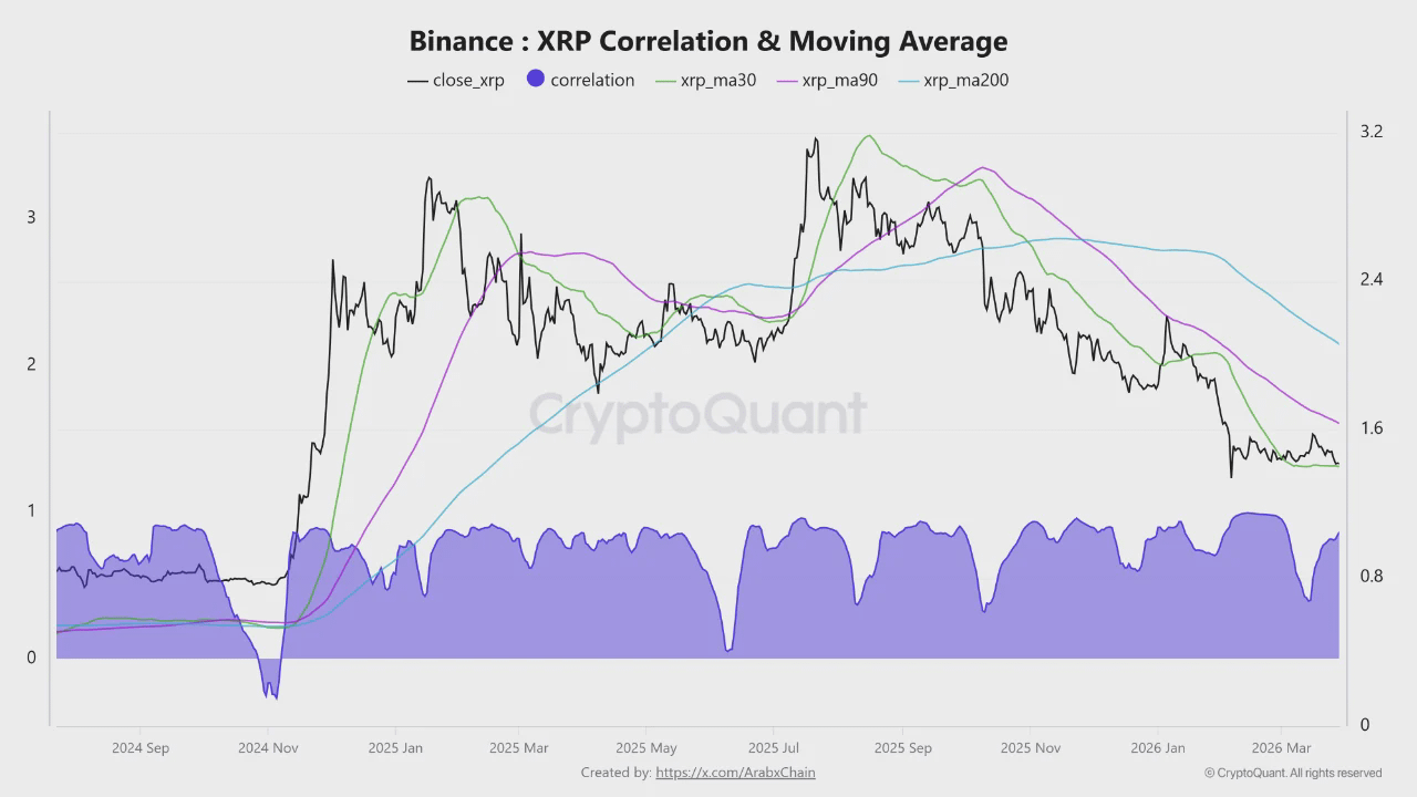 Asta este exact motivul pentru care corelația cu Bitcoin contează atât de mult în acest moment. Corelația XRP cu BTC citește aproximativ 0.87, istoric ridicată, ceea ce înseamnă că XRP nu se tranzacționează pe propria narațiune într-un sens independent. Se mișcă împreună cu Bitcoin. Impulsul Bitcoin de miercuri dimineața de peste $69,000, determinat în parte de semnalul de încetare a focului din Iran peste noapte, trage XRP împreună cu el. O rally sustenabilă a Bitcoin ar putea oferi XRP catalizatorul extern de care are nevoie pentru a testa $1.40. O respingere la rezistența Bitcoin trage întreaga configurare înapoi spre $1.31, iar mediile mobile reafirmă controlul înainte ca arc să fie vreodată tras.