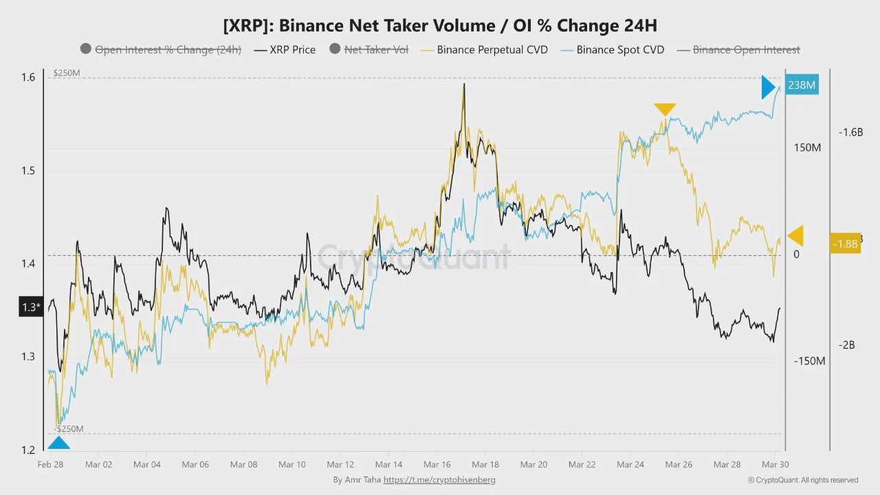 Structura internă a pieței XRP este cât se poate de strânsă fără a se mișca efectiv. Oferta se epuizează. Cererea spot se acumulează. Short-urile sunt stivuite deasupra în perpetue. Harta lichidării transformă acea poziționare short în combustibil de rachetă dacă prețul trece de $1.35.