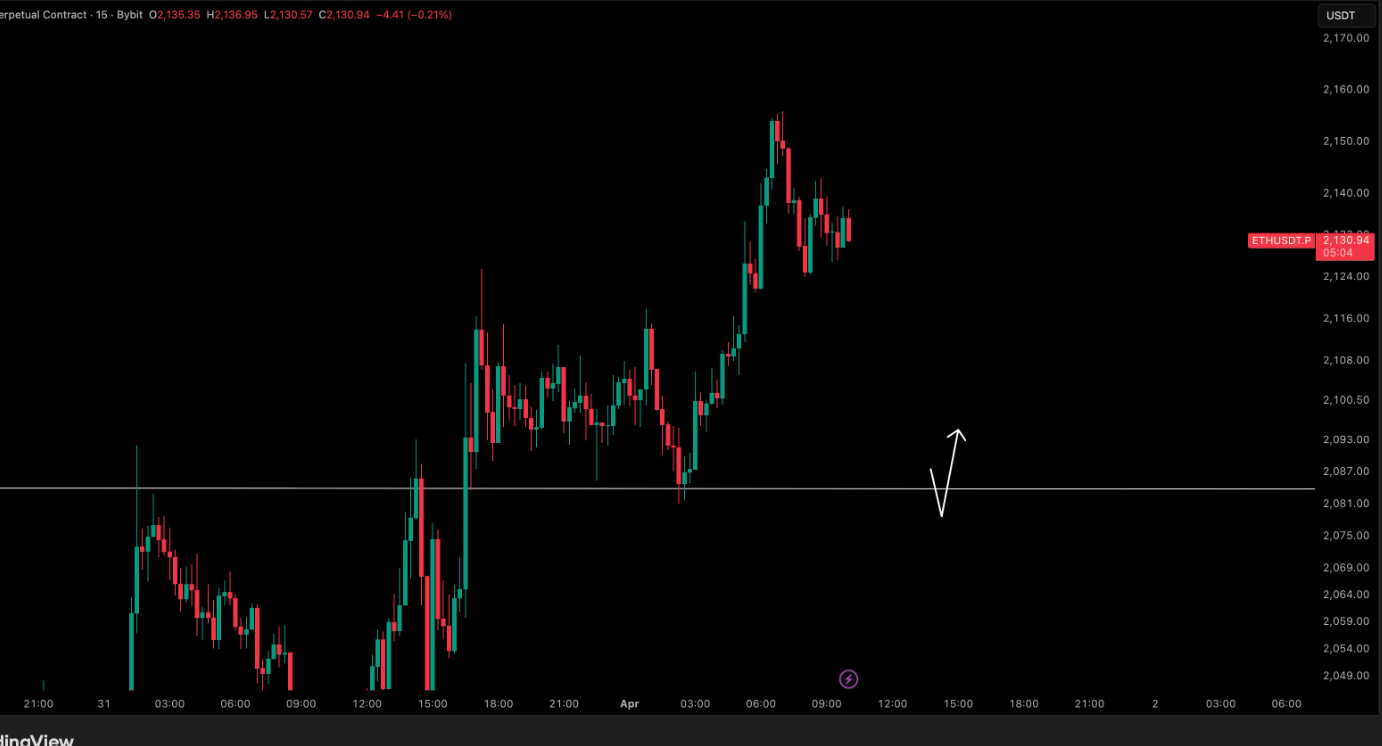 The chart shows ETHUSD pushing aggressively higher from below the $2,080 level into the $2,140-$2,150 zone. This rally formed a clear impulsive structure, with consecutive bullish candles driving price upward without any meaningful pullbacks along the way.