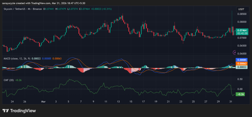 أما في حال حدوث انعكاس في اتجاه سوق SKY، فسيلغي ذلك المكاسب الأخيرة، وقد يهوي السعر إلى مستوى الدعم عند 0.07249 دولارًا. وقد يؤدي تصحيح هبوطي مستمر إلى انخفاض السعر نحو 0.070 دولارًا أو حتى أقل، مصحوبًا بتشكل نمط التقاطع المميت.