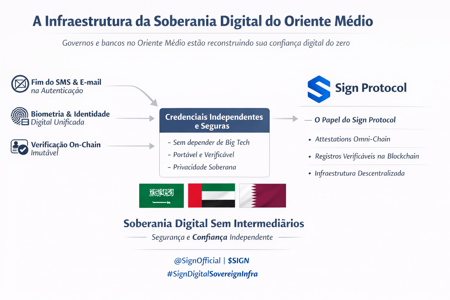 O $SIGN não é um app de assinatura digital. É um protocolo de attestation omni-chain — ou seja, ele permite que governos, bancos e empresas criem registros de verificação que existem na chain, não dentro do servidor de uma empresa privada. Quando o Catar lança seu sistema de identidade digital unificado, quando a Jordânia conecta o banco Arab Bank ao ID nacional Sanad, quando o UAE impõe autenticação de nível governamental no sistema financeiro — todos esses casos precisam exatamente do que o Sign Protocol oferece: verificação que não depende de um intermediário centralizado pra ser válida.