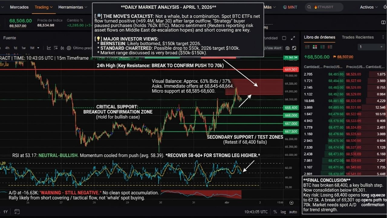 My final read is this: bullish in the short term, but not entirely clean yet. The strongest part of the bullish case is in the price, volume, order book, and funding. The part that still does not fully convince is Accumulation/Distribution, which remains negative. If BTC breaks 69,301, the market can go for 70K. If it loses 68,400, there is a risk that this rally will end up looking like a good breakout that still has not been fully consolidated.