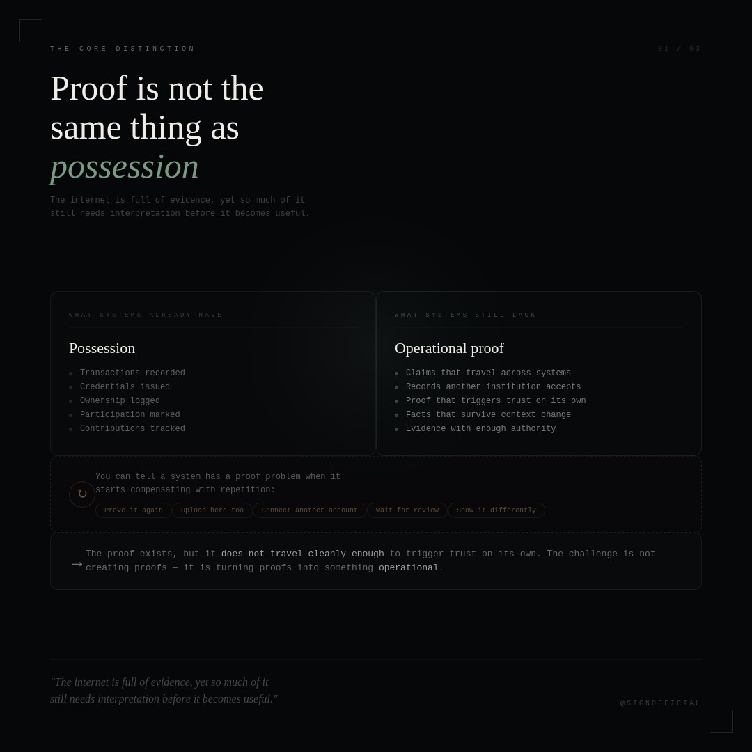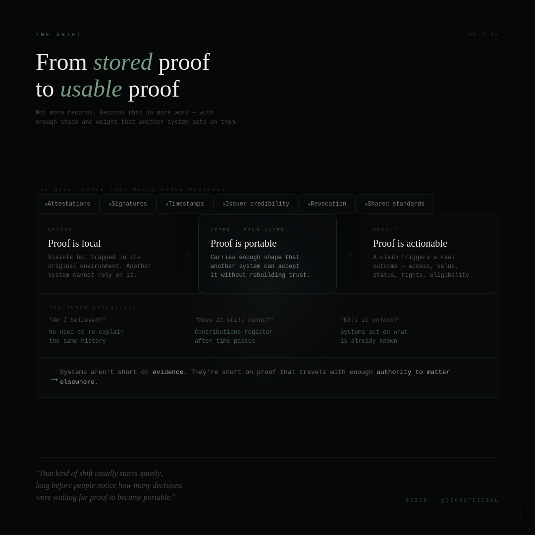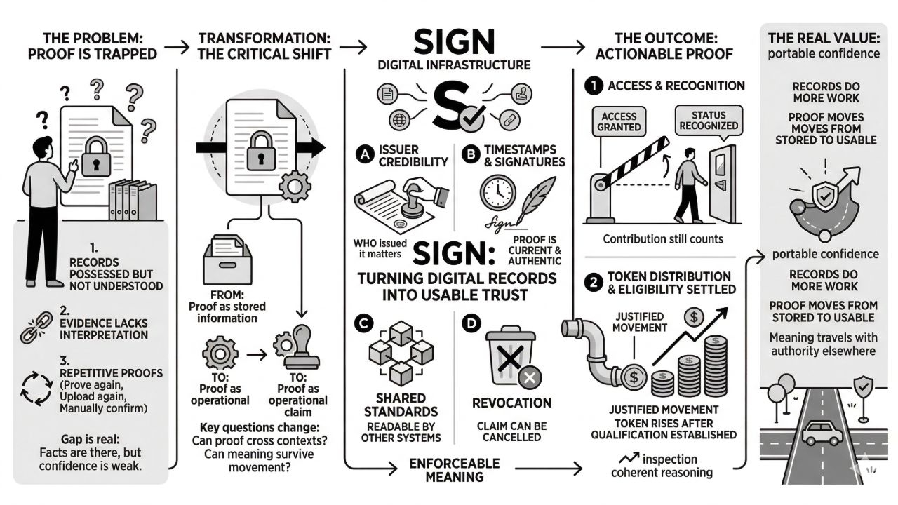 Because most digital systems are not short on evidence. They are short on proof that travels with enough authority to matter elsewhere. So when I think about SIGN from this angle, I do not really see a loud attempt to create more records. I see an attempt to make records do more work. To help proof move from being stored to being usable... To let a claim carry enough shape, and enough weight, that another system can do something real because of it.