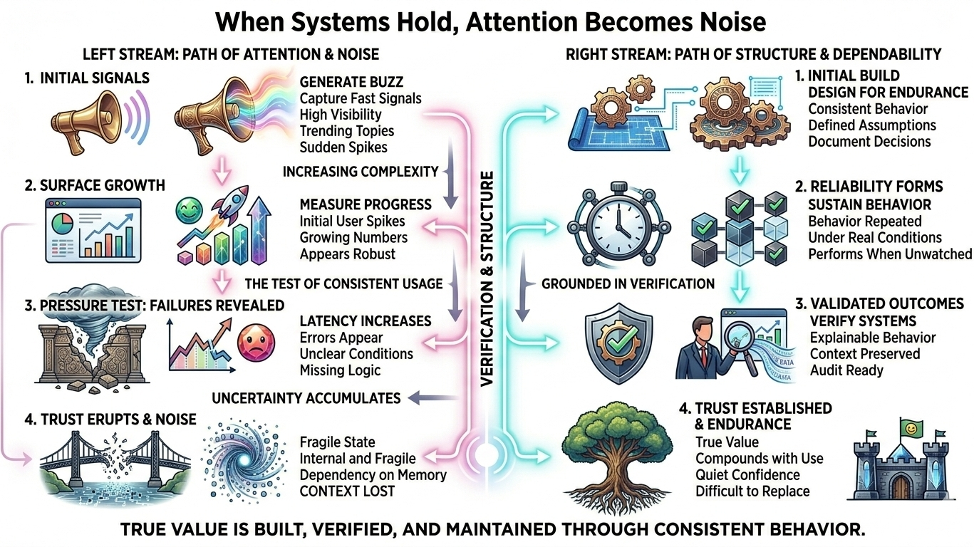 What’s changing is not just how systems are built, but how they are evaluated. Attention still creates moments of visibility, but it no longer guarantees anything beyond that moment. What lasts is behavior that can be observed repeatedly, validated consistently, and trusted over time. This is where value begins to shift—from what is seen, to what can be relied upon.