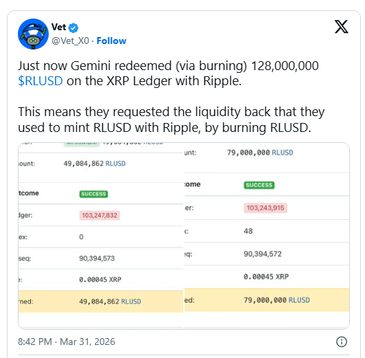 Validatorul XRPL Vet a raportat dezvoltarea devreme, confirmând că Gemini a efectuat o răscumpărare semnificativă RLUSD on-chain. Vet a clarificat natura tranzacțiilor și a abordat speculațiile în creștere, subliniind că activitatea a urmat un model operațional standard, mai degrabă decât să semnaleze vreo schimbare neobișnuită pe piață.