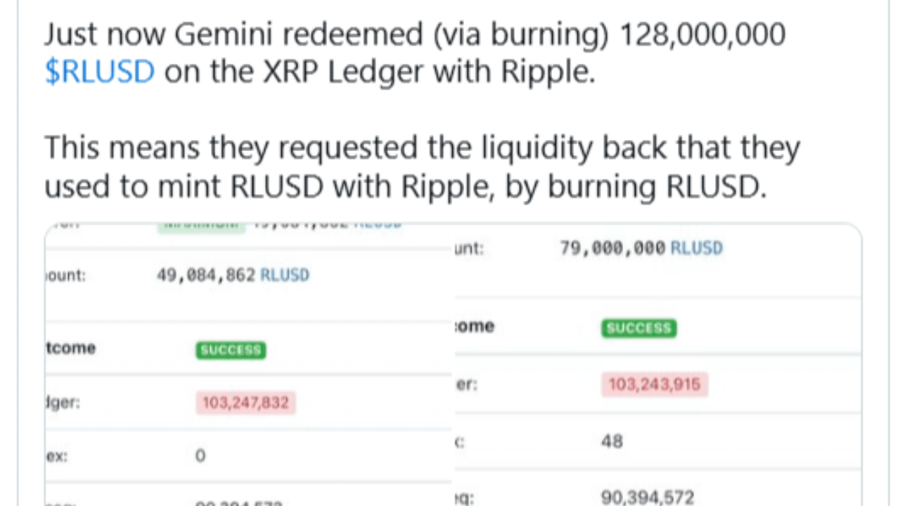 Gemini a ars un total de 128 de milioane de RLUSD prin două tranzacții confirmate pe XRP Ledger. Tranzacțiile, aproximativ 49.08 milioane și 79 milioane RLUSD, au fost executate cu succes și rămân verificabile public. Aceste ardere au redus oferta circulantă de RLUSD în timp ce au deblocat simultan lichiditatea echivalentă în USD ținută ca suport.
