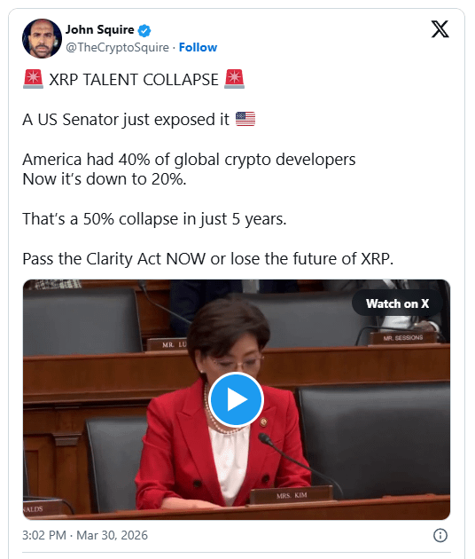 Într-un tweet recent, Squire a declarat că SUA odată reprezentau 40% din dezvoltatorii globali de criptomonede, dar acum dețin doar 20%, descriind aceasta ca o prăbușire de 50% în cinci ani. El a atribuit această schimbare incertitudinii reglementare și a solicitat acțiuni legislative imediate prin Legea CLARITATE pentru Piața Activelor Digitale.