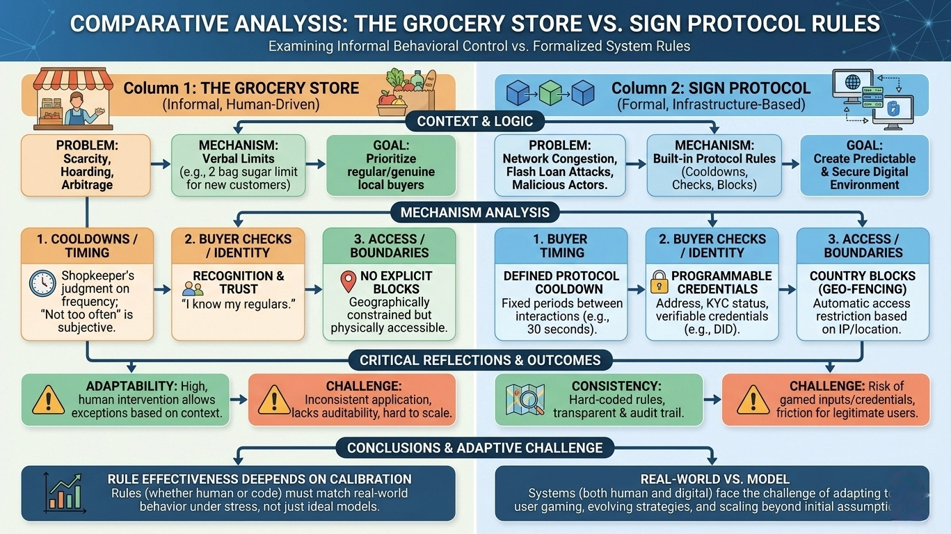 When I think about Sign Protocol’s built-in rules—cooldowns, buyer checks, and country blocks—I see something similar, but formalized into infrastructure. These mechanisms are essentially attempts to encode behavioral assumptions into the system itself. Instead of relying on human judgment like the shopkeeper does, the protocol tries to predefine how participants are allowed to interact. In theory, this reduces abuse, aligns incentives, and creates a more predictable environment. But in practice, it raises deeper questions about how systems behave once real users, with real incentives, begin to engage.