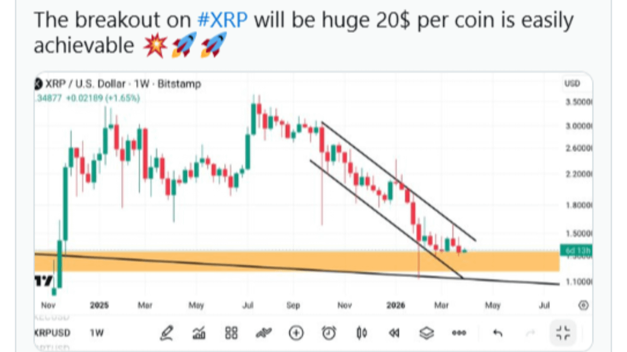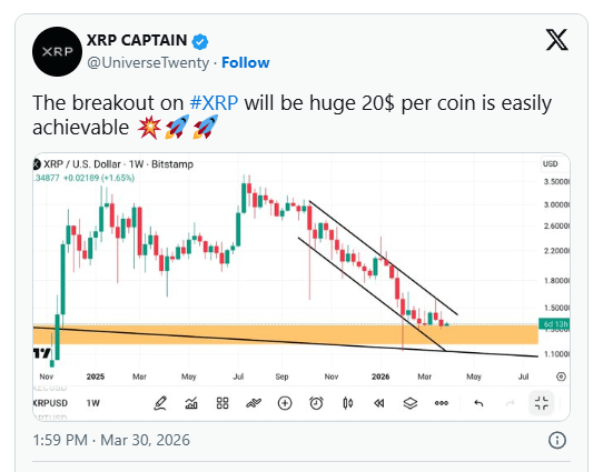 Convergența canalului descendent cu zona de suport evidențiată formează baza proiecției analistului. Postarea lui XRP Captain implică faptul că o mișcare decisivă în afara canalului, în special în sus, ar putea marca începutul unei etape mai mari de expansiune a prețului. Obiectivul de $20 menționat în postare reprezintă o creștere substanțială față de intervalul actual de tranzacționare aproape de $1.30.
