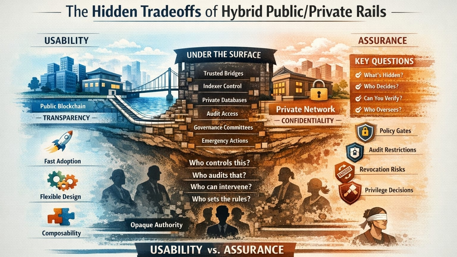 That is the hidden risk here. Not that hybrid rails are fake. Not that the model is incoherent. The risk is subtler than that. It is that the system can create the feeling of reduced trust while actually redistributing trust into narrower, less visible, more respectable corners.