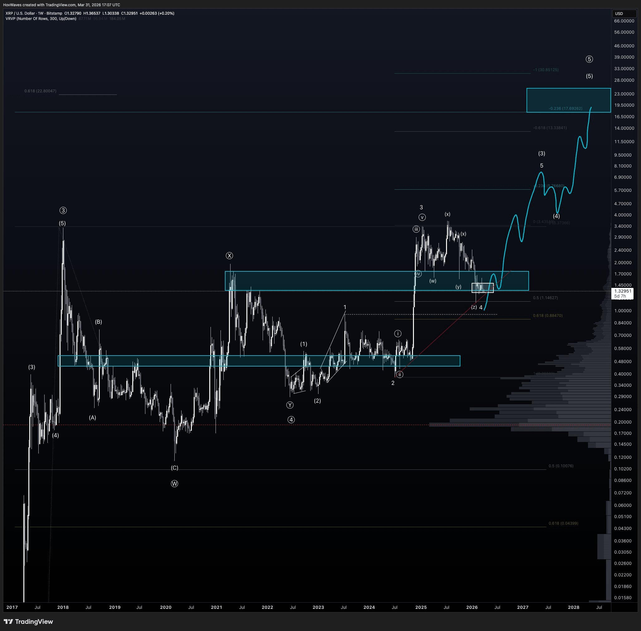 Graficul arată mai multe dintre aceste valuri corective, inclusiv (w), (x) și (y). Ca context, aceste modele indică acțiuni de preț zgomotoase și suprapuse, care adesea arată incertitudine pe piață. Hov vede acest lucru ca un semn că XRP este încă într-o fază corectivă, neîncepând o mișcare ascendentă puternică.