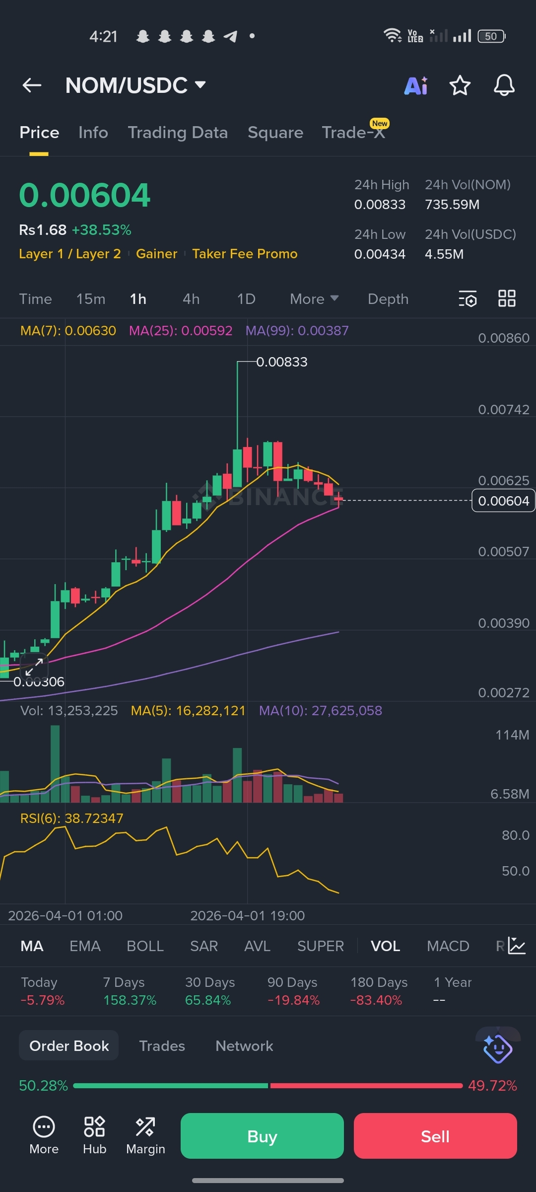 NOM surged +38.53% in the last 24 hours, reaching a high of $0.00833 before pulling back. This is a classic pump-and-cool structure.
