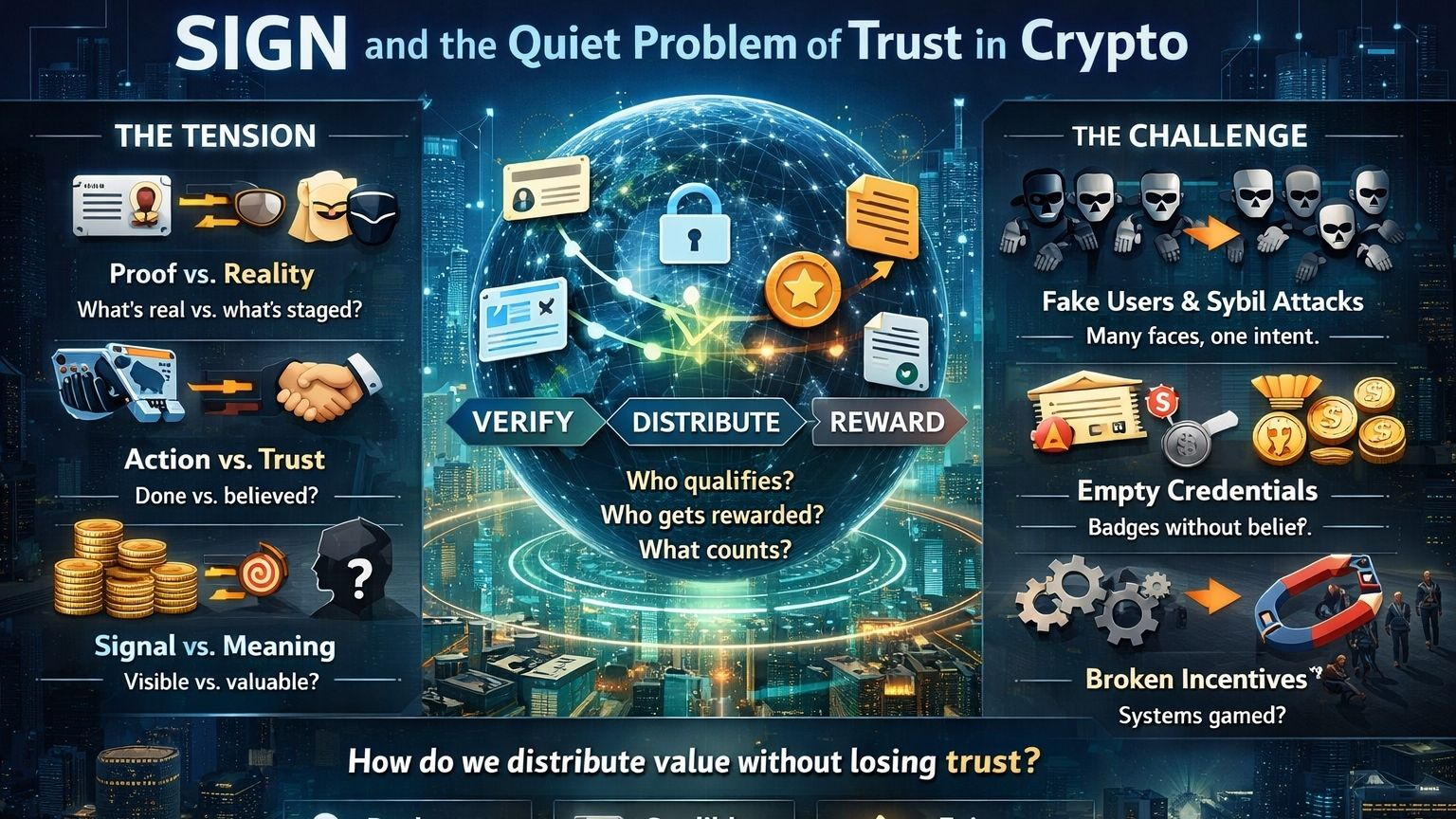 But the more I came across SIGN, the less it felt like just another project trying to position itself inside a trendy category. It started to feel like it was sitting near a problem that keeps coming back, no matter how many times crypto changes its vocabulary. Not a new problem. Not even a crypto problem, really. Just an old question that keeps showing up in new systems. How do you know what is real, what should count, and who should receive something when every signal can be copied the moment it starts to matter?