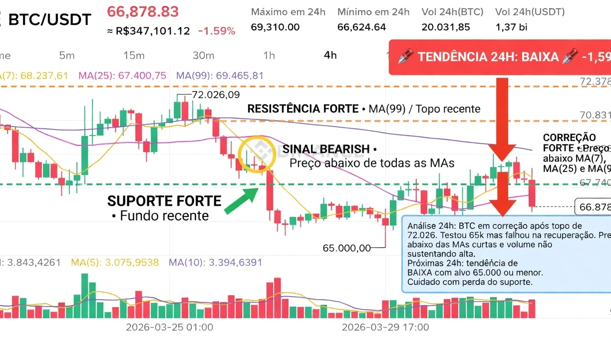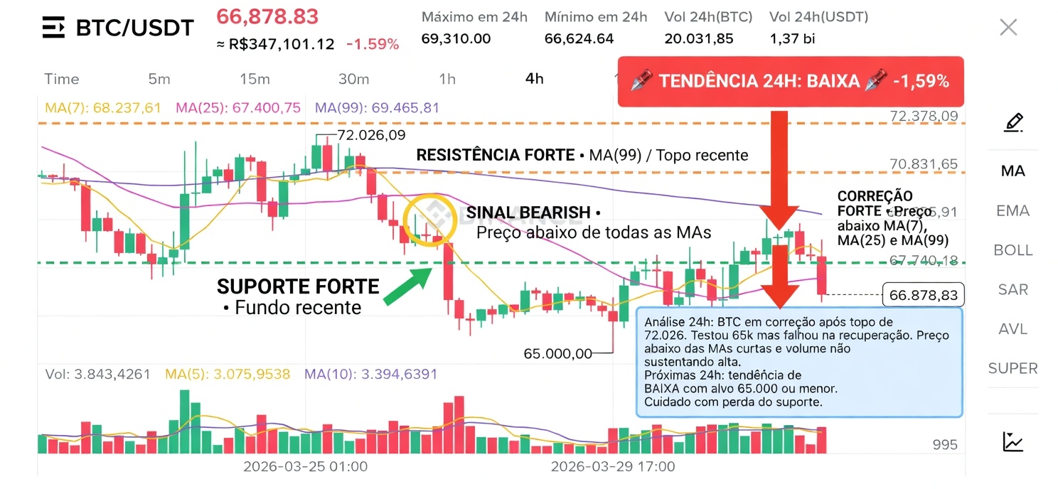BITCOIN -1,59% nas últimas 24h, preço a 66.878 e o BTC voltou a cair depois de falhar no rebote dos 65k. Preço abaixo de TODAS as médias (MA7, MA25 e MA99) e volume empurrando pra baixo. Correção forte no curto prazo!