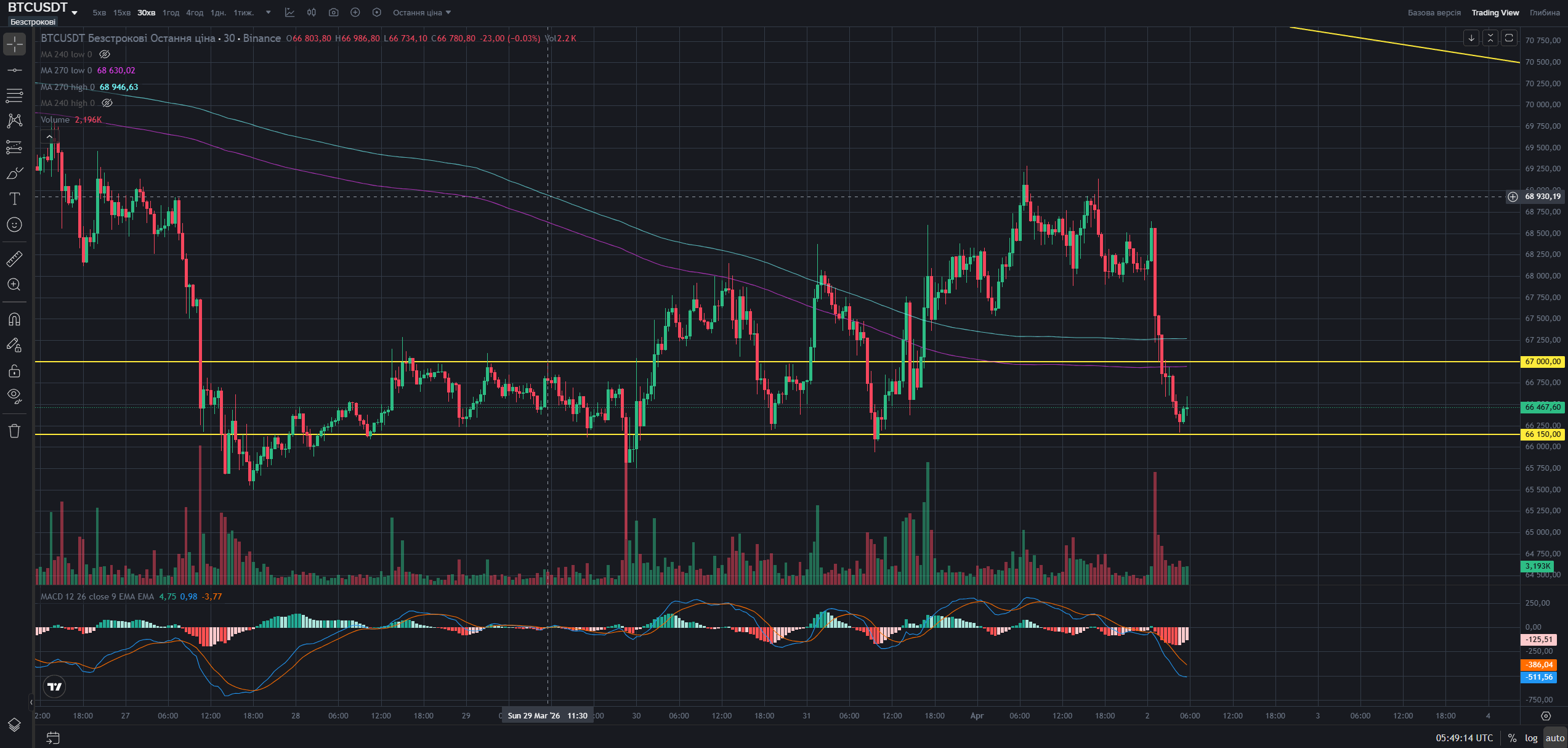 Ознака: Ціна «прилипає» до рівня. Замість швидкого відскоку ми бачимо дрібні свічки, що туляться до 67 000 або 66 150. Це консолідація — ринок накопичує порох для вибуху.