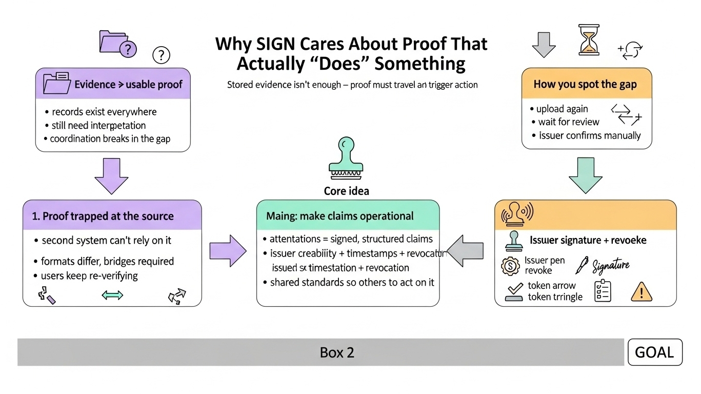 it’s easy to confuse having evidence with having usable proof. a wallet can hold an asset, a user can have a history of actions, a system can store credentials and logs. but none of that automatically tells a second system what to do with it. the internet is full of records, yet so many of them still need interpretation before they become actionable. that gap is where coordination breaks.