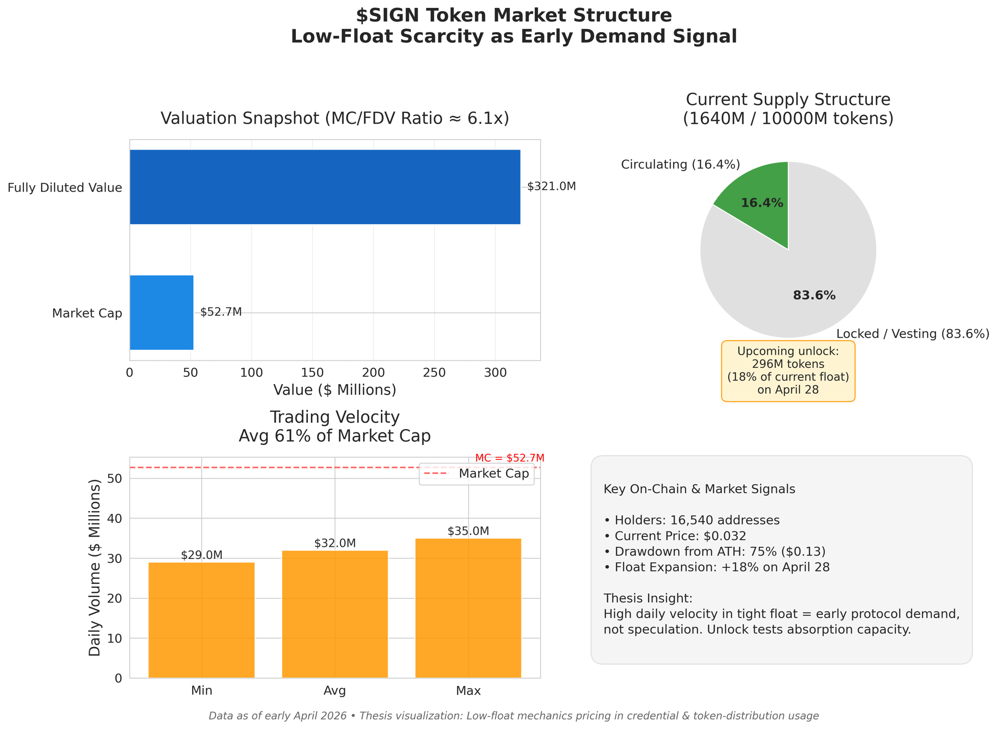 Here’s the non-obvious thing I’ve landed on. The market is treating $SIGN’s current scarcity like a fragile party trick that’s about to end with the April 28 backer unlock. I see the opposite. That same constrained supply, paired with the kind of daily trading volume that would look ridiculous on a larger float, is actually the earliest evidence that real credential verification and token-distribution activity is already generating sticky, protocol level buying pressure. The unlock isn’t dilution risk; it’s the moment the token gets enough liquidity to let that early demand breathe and scale.