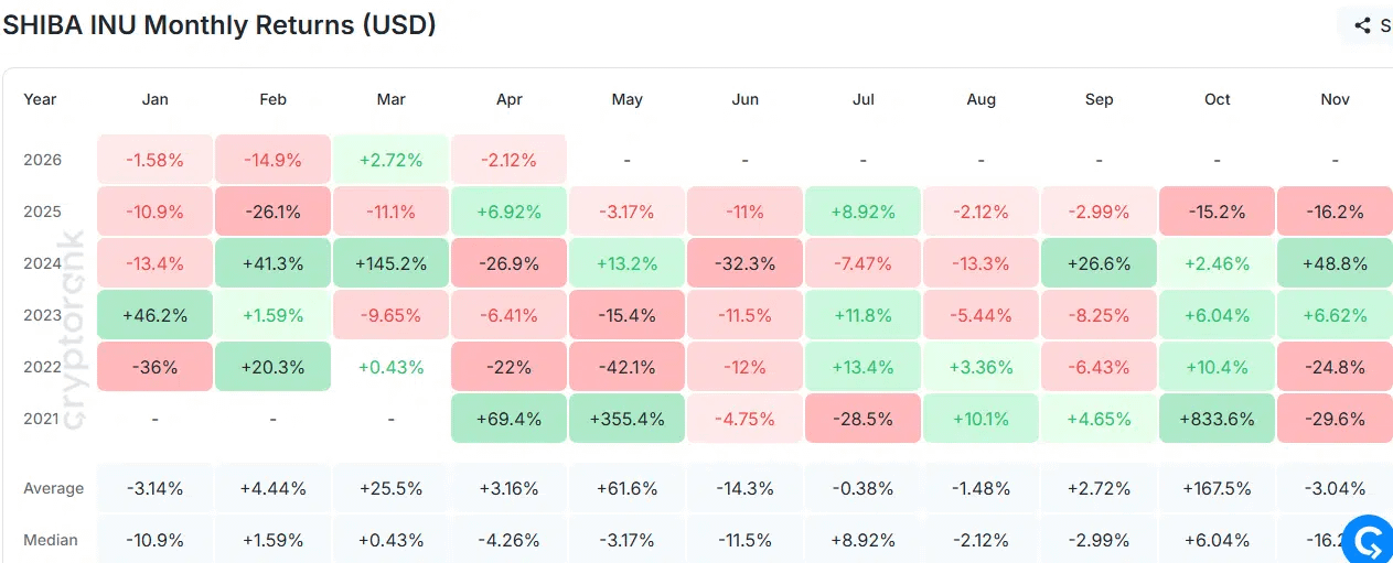 Cu toate acestea, datele istorice de la CryptoRank sugerează că SHIB încă înregistrează un randament mediu în aprilie de aproximativ 3.16%, chiar dacă performanța mediană rămâne negativă la 4.26%.
