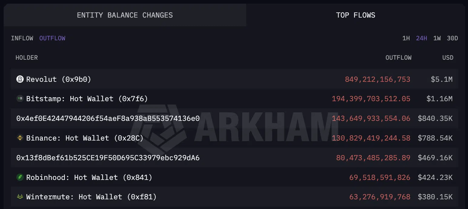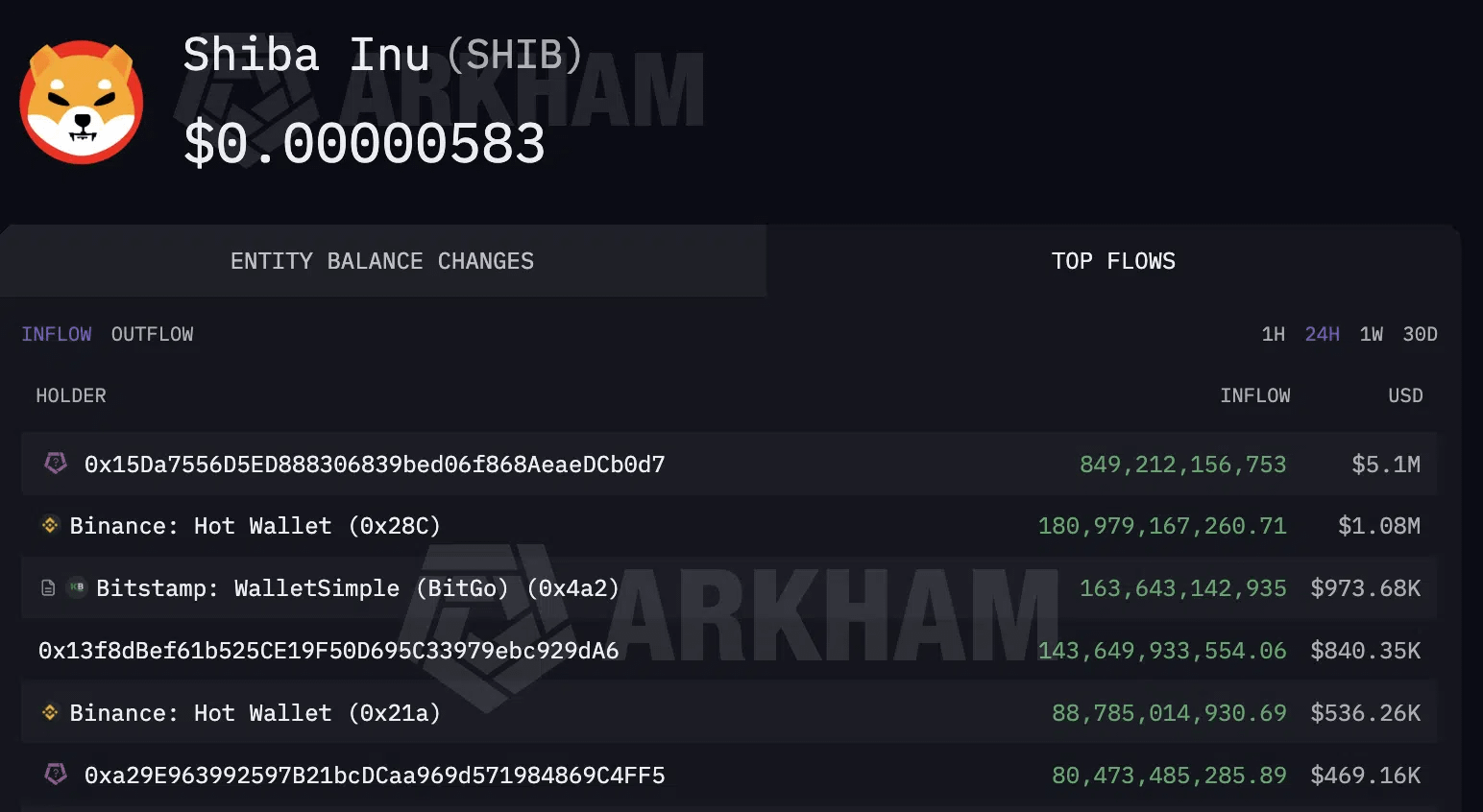 În mod notabil, mai multe entități, inclusiv Revolut, Binance și Bithumb, au contribuit la fluxul net de aproape 5 miliarde de tokenuri SHIB în schimburi.