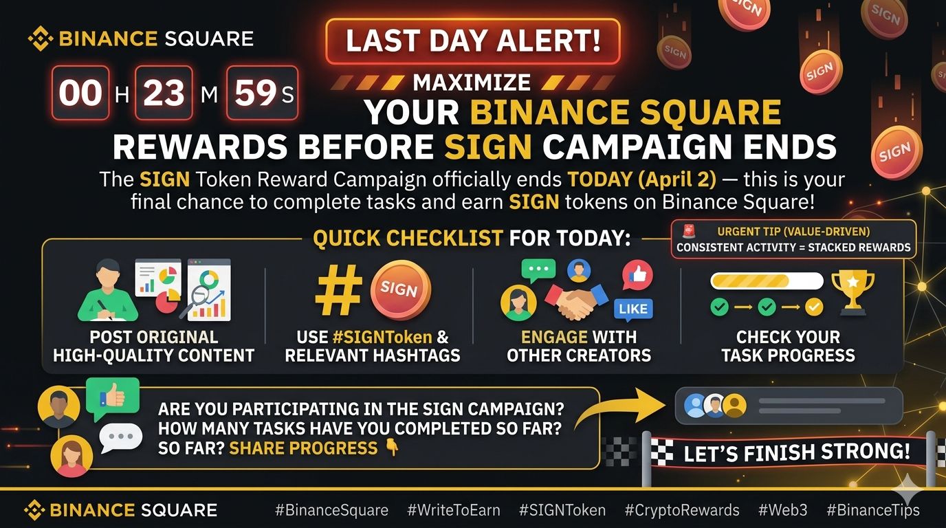 Campania de recompense pentru TOKENUL SIGN se încheie oficial ASTĂZI (2 aprilie) — aceasta este ultima ta șansă de a finaliza sarcini și de a câștiga tokenuri SIGN pe Binance Square! Lista rapidă de verificare pentru astăzi: Postează conținut original, de înaltă calitate (perspective de piață, sfaturi sau informații legate de campanie)